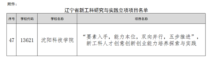 我校申报的《“要素入手,能力本位,双向并行,五步推进”,新工科人才创意创新创业能力培养探索与实践》在“辽宁省新工科研究与实践项目”中喜获立项。这是我校历史上首次获得教育部组织的该类项目立项。新工科建设是国家主动应对新一轮科技革命和产业变革挑战,紧密围绕国家战略和区域发展需求,服务国家创新驱动发展重大战略实施的行动计划,旨在持续深化工程教育改革,培养造就一大批多样化、创新型卓越工程科技人才。
