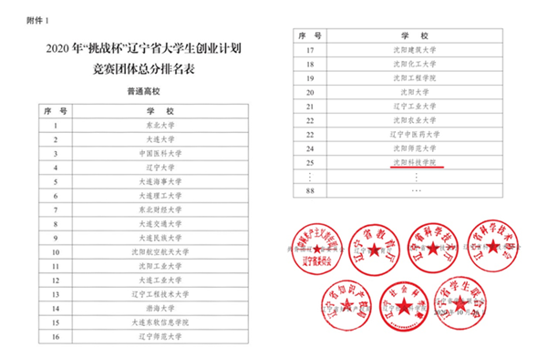 1. 2020年辽宁省大学生“挑战杯”大赛,我校喜获1项金奖、5项银奖、15项铜奖,获奖总数在全省参赛的88所学校中排名第25位,在民办高校中排在第2位。此赛,我校最近连续五年在全省高校中排名在前30%,在民办高校中始终排名一、二,稳居高校林丛前列,五年总成绩在民办高校首位。