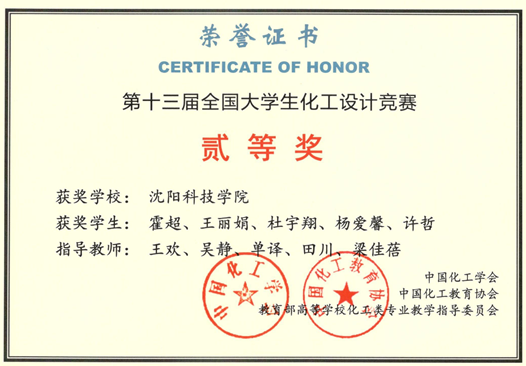 12.在全国大学生化工设计大赛中,我校喜获国家级二等奖1项,优秀奖1项,东北赛区一等奖1项,省级三等奖2项。