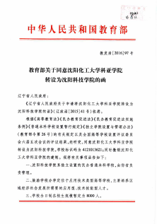 附:教育部关于同意沈阳化工大学科亚学院转设为开云官网首页(中国)集团的函