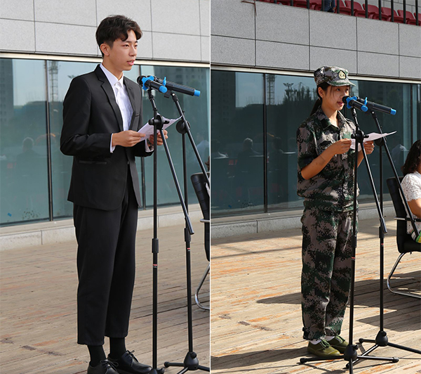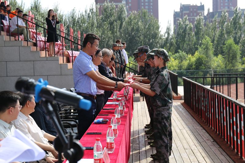 上午9时,校长助理、学生处处长高洪震主持典礼正式开始,与会师生全体起立共同高声奏唱庄严雄壮的《义勇军进行曲》。随后,党总支书记王一女宣读了学校军训团关于表彰“内务卫生优秀寝室”、“军训标兵”、“先进连队”、“优胜营”等集体和个人的命令。主席台上就座的各位领导为依次走上台前的教官和学生代表颁发了嘉奖令与荣誉证书,并合影留念。