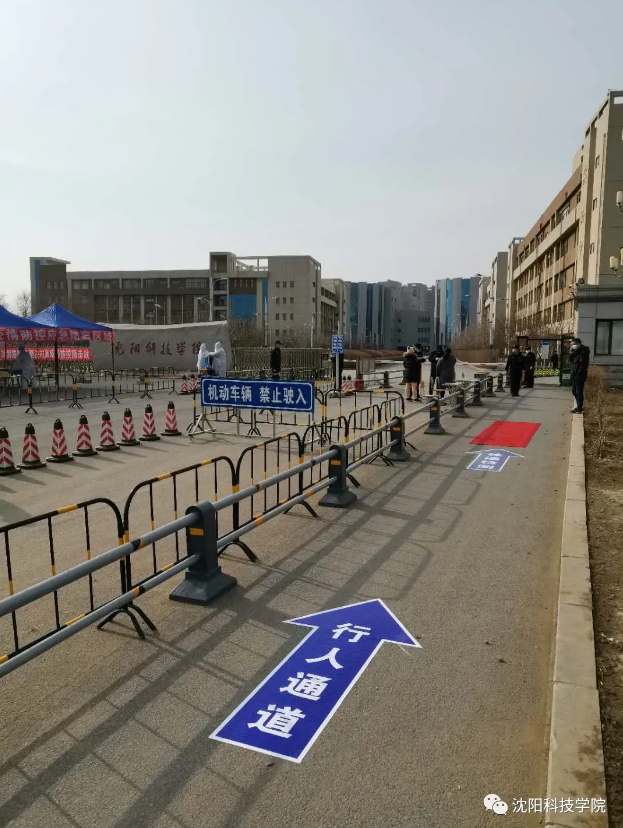 ↑↑↑“学生”入校,在登记区排队,排队间隔1.5米。