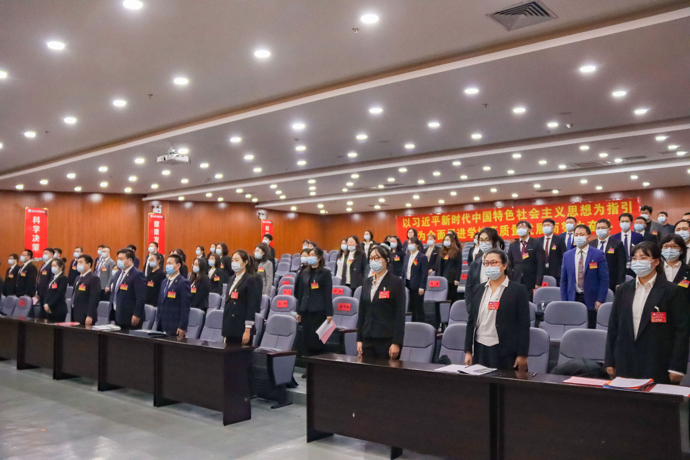 在学习宣传贯彻党的十九届六中全会精神之际,12月8日,我校在图书馆报告厅隆重召开第一届教职工代表大会暨工会会员代表大会第一次全体会议。学校党政领导全体成员出席大会,来自全校各单位、部门的59名正式代表和14名列席代表齐聚一堂,以高度的责任感和使命感,谋划新时期学校高质量发展大计。