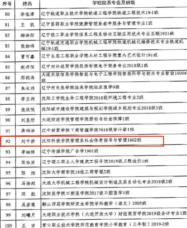 为进一步加强高校学生党建工作,充分发挥大学生党员先锋模范作用和典型示范引领作用,近日省委教育工委面向全省普通高校评选表彰100名优秀大学生党员。经学校党委推荐、省委教育工委专家评审、网络公示,我校管理系社会体育指导与管理专业学生刘千侨荣获“辽宁省优秀大学生党员”称号。