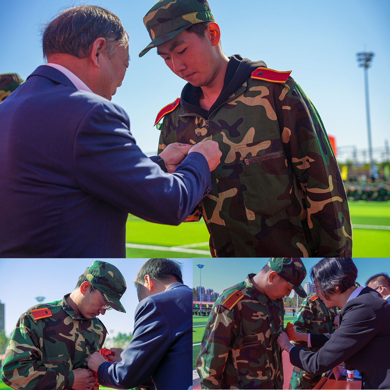 纪委书记、副校长高洪震宣读《关于表彰2022年学生军训先进集体和优秀个人的决定》。校领导依次为获奖集体及个人颁发证书并为新生代表佩戴校徽。