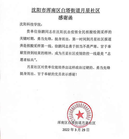 白塔街道星月社区对沈科的暖心帮助与支持表示十分的感谢。