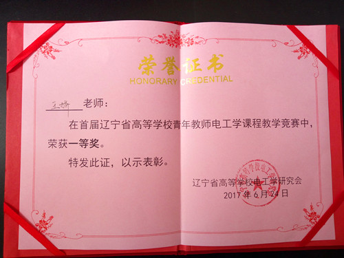 2017年6月24日,由中国高等学校电工学研究会主办的首届辽宁省电工学课程教学竞赛在大连理工大学举行。我校信息与控制工程系王娇老师代表学校参赛,荣获辽宁省一等奖,并被辽宁省推荐到全国电工学课程教学竞赛。
