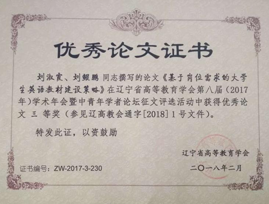 近日获悉,我校教师在辽宁省高等教育学会举办的“辽宁省高等教育学会第八届学术年会暨中青年学者论坛征文评选活动”中获得了优秀论文的好成绩。其中,基础部刘淑霞、刘鲲鹏老师撰写的《基于岗位需求的大学生英语教材建设策略》荣获优秀论文三等奖;基础部韩云龙老师撰写的《“互联网+教育”下“慕课”在高等数学中的应用研究》荣获优秀论文三等奖。