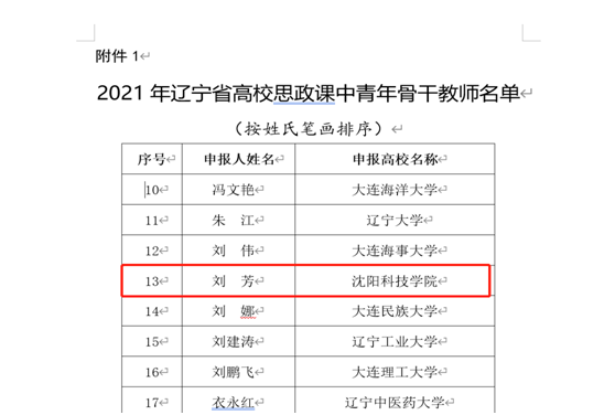 在“2021年度辽宁省高校思想政治理论课创优计划”系列活动中,思政部主任刘芳老师被评选为“辽宁省高校思想政治理论课中青年骨干教师”。