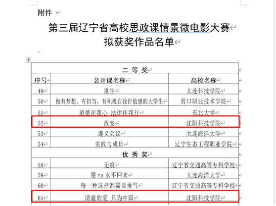 在第三届辽宁省高校思政课情景微电影大赛中,我校学生拍摄的微电影《改变》(指导教师刘丹丹)荣获二等奖,《清澈的爱,只为中国》(指导教师李淑娟)荣获优秀奖。