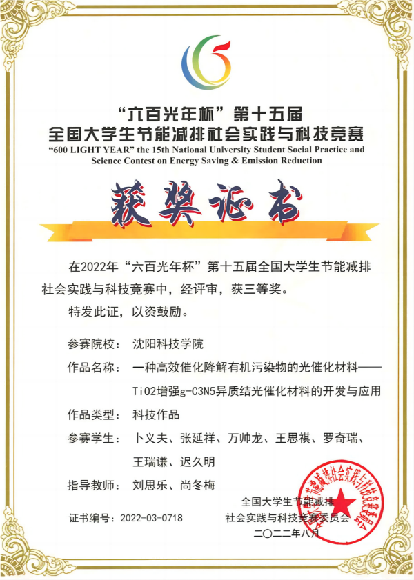 近日,由教育部高等教育司主办的“六百光年杯”第十五届全国大学生节能减排社会实践与科技竞赛落下帷幕,经过激烈的角逐,我校参赛作品《一种高效催化降解有机污染物的光催化材料—Ti02增强g—C3N5异质结光催化材料的开发与应用》荣获全国三等奖。