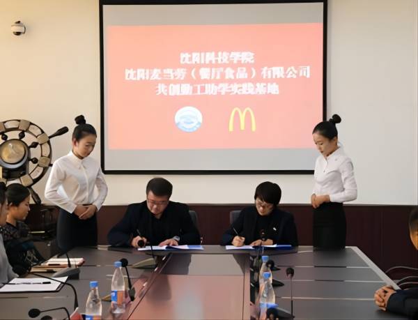 10月26日下午,我校与沈阳麦当劳(餐厅食品)有限公司在第一会议室签订了关于在校大学生勤工助学项目的校企合作协议。学校主管领导以及沈阳麦当劳餐厅食品有限公司人力资源经理鲁敬、人力资源顾问尹君玖、营运顾问周明出席会议,学生处、校团委主要负责同志和各系分团委书记参加了签订仪式。