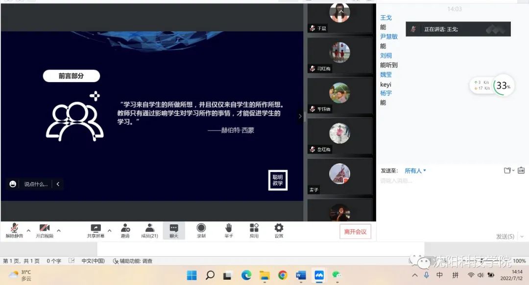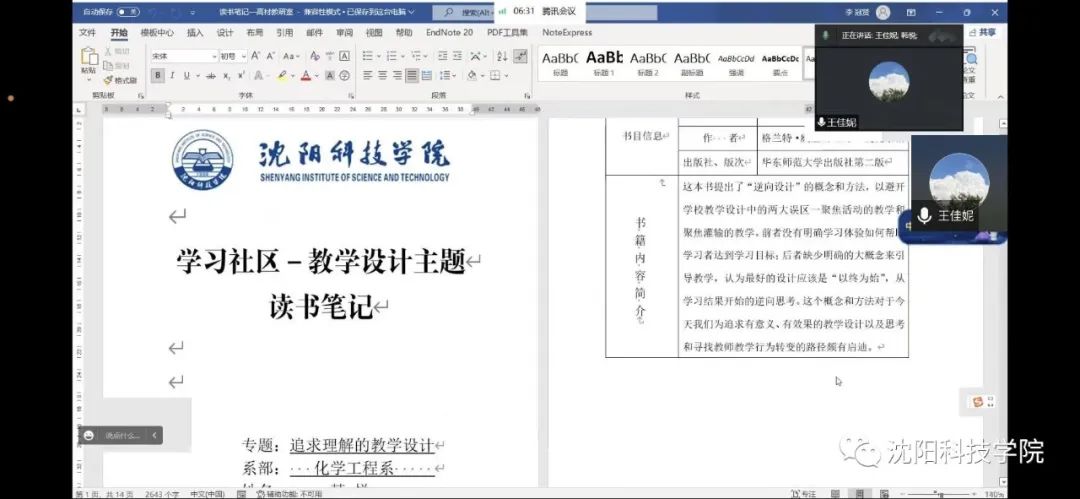 第三社区信息与控制工程系王赛男老师组织召开了第三小组读书活动动员大会。本次会议采取腾讯会议的方式进行,会上主要就如何高效地开展读书活动展开了研讨,会中对读书活动任务进行了布置。第三小组阅读的书籍为英文书籍,王赛男老师分享了高效阅读英文书籍的方法。通过本次会议,第三社区全体教师明确了读书活动的意义,探讨了读书活动的开展方法。教师们纷纷表示,要利用好这十个月的时间,读好书,多读书,将读书成功转化为教学成果,为学校高质量推进创新型、应用型人才做出贡献。