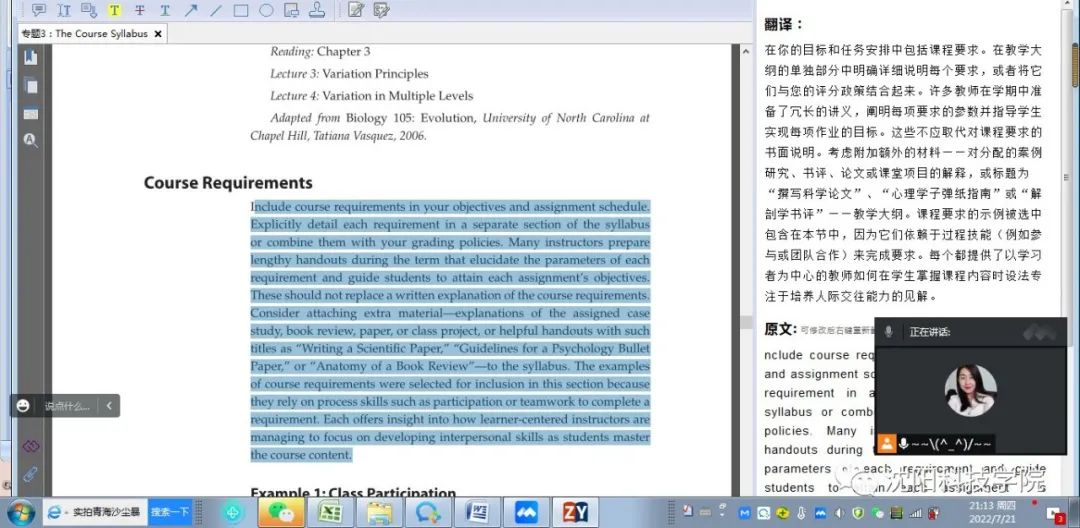 第九社区基础部阅读《Developing Outcomes-based Assessment for Learner-centered Education》。本书主题是基于“产出导向法”理论进行教学设计,强调对学习者产出成果的有效评价。领读彭博教师就本书第一章和第二章内容做了领读介绍:阐述以学生为中心,以产出为导向的教学评估意义和重大价值,以及教师建立产出导向的教学评估的实践意义。领读顾菲老师谈了对本书第一章和第二章的理解:学生进行选择性学习,教师给予指导并检查,学生从输入材料中选择产出任务所需内容,教师检查学生选择性学习的效果。在教师的指导下循序渐进的进行,且练习结束后立即进行评估。产出任务能帮助学生明确学习对未来工作的价值,同时能帮助学生意识到自身能力的不足,增强学习紧迫感。