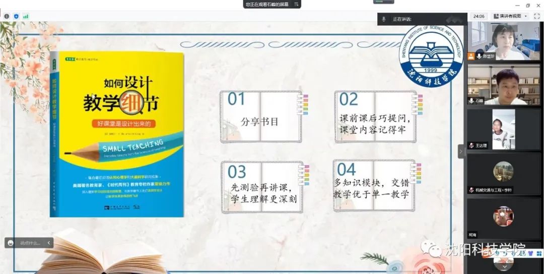 书籍是人类进步的阶梯,大学教师根据阶段性的主题任务,组建学习社区,及时开展交流,以促进和改善教师的教学、加强教师间有关学生学情的沟通与合作等活动,已经被广泛证明是行之有效的举措。在学校合格评估建设的关键时期,我校组织“沈科评好我做主”系列活动之五:学习社区——教学设计主题系列读书活动。