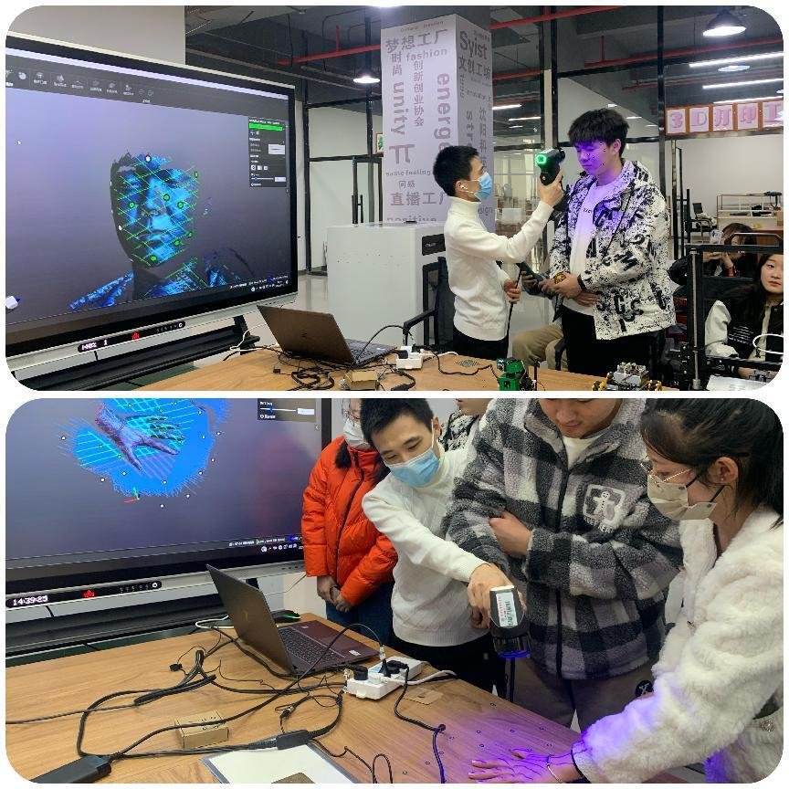 在三维扫描仪培训中,两位工程师讲解三维扫描仪的基本操作、标定点的布置及采集、模型点云数据的采集、模型的编辑与输出为主要内容。同学们运用仪器对零部件、人体局部进行全景三维扫描,仅用十几分钟即完成点云数据,获取三维模型。通过三维模型软件,在计算机上即可生成模式参数,随时查询任意点的三维坐标,提取任意需要的数据信息,并根据软件处理结果直接生成所需的存档文件,提高了测绘的效率和精确性。