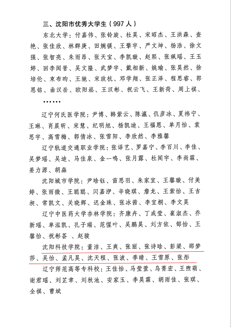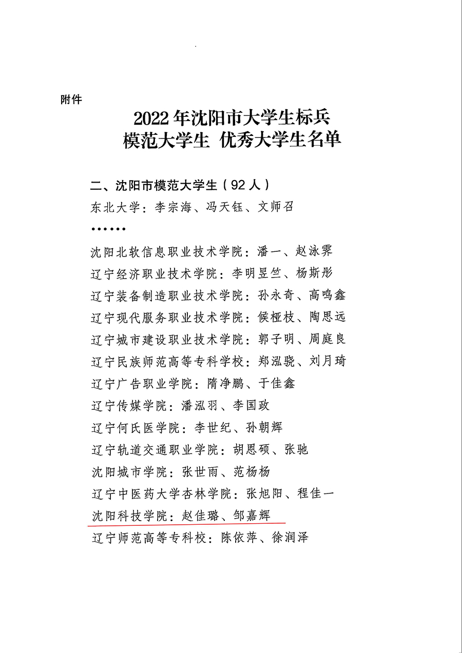 为深入学习贯彻习近平新时代中国特色社会主义思想,学习宣传贯彻党的二十大精神,扎实推进沈阳高校大学生思想政治教育工作,挖掘和选树大学生先进典型,中共沈阳市委教科工委组织开展的2022年沈阳市“十百千”优秀大学生评选活动结果近日公布。我校赵佳璐、邹嘉辉同学荣获“沈阳市模范大学生”称号;董洁等13名同学荣获“沈阳市优秀大学生”称号。