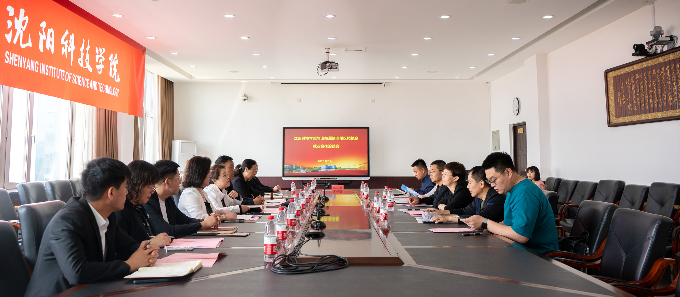 校地企就业合作洽谈会在505会议室召开。我校校长孙玉红、副校长王鸿鹏、相关系部负责人,淄博市淄川区人力资源和社会保障局党组书记、局长刘芳,淄博市淄川区人力资源和社会保障局党组成员,公共就业和人才服务中心党支部书记、主任李贵友、淄博市淄川区财政局党组成员、副局长于建国等领导出席本次会议。本次会议由副校长王鸿鹏主持。