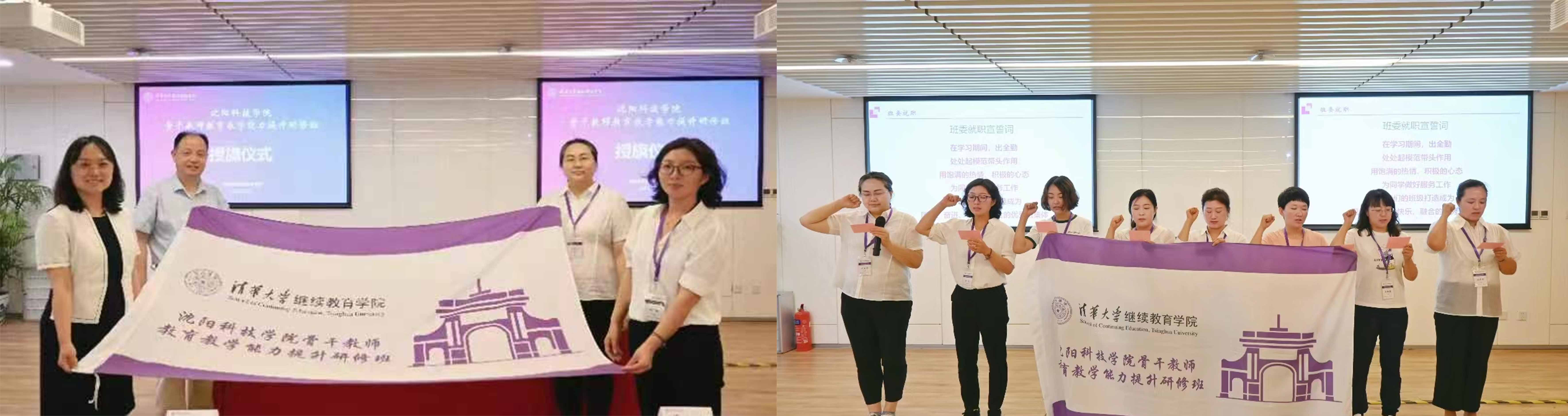 在开班仪式上,郭钊副院长致欢迎词,华玉瑶代表研修班学员发言,希望研修班所有教师在清华大学“行胜于言”的校风指引下,在聆听大师声音,开启心智的同时,每天均有新的收获,并应用于日后的课程教育教学中。在开班仪式中,华玉瑶、刘佳代表本次研修班的全体学员接受了清华大学继续教育学院授予的班旗,班委成员在班旗下宣誓竭尽所能更好地确保本次研修活动有序、有效的开展,更好地实现学有所悟、学以致用。