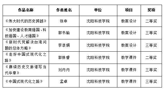 近日,由中共沈阳市委教科工作委员会主办的“2023年沈阳高校形势与政策课教育教学大赛”获奖情况已揭晓,在教案设计和教学课件两个组类的比赛中,我校共有6项作品获奖,其中教案设计荣获二等奖1项、三等奖2项;教学课件荣获二等奖1项、三等奖2项。