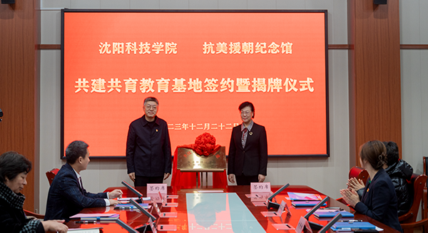 抗美援朝纪念馆党委书记、馆长刘静媛与我校党委书记耿乃国共同为“开云官网首页(中国)集团共建共育教育基地”揭牌。