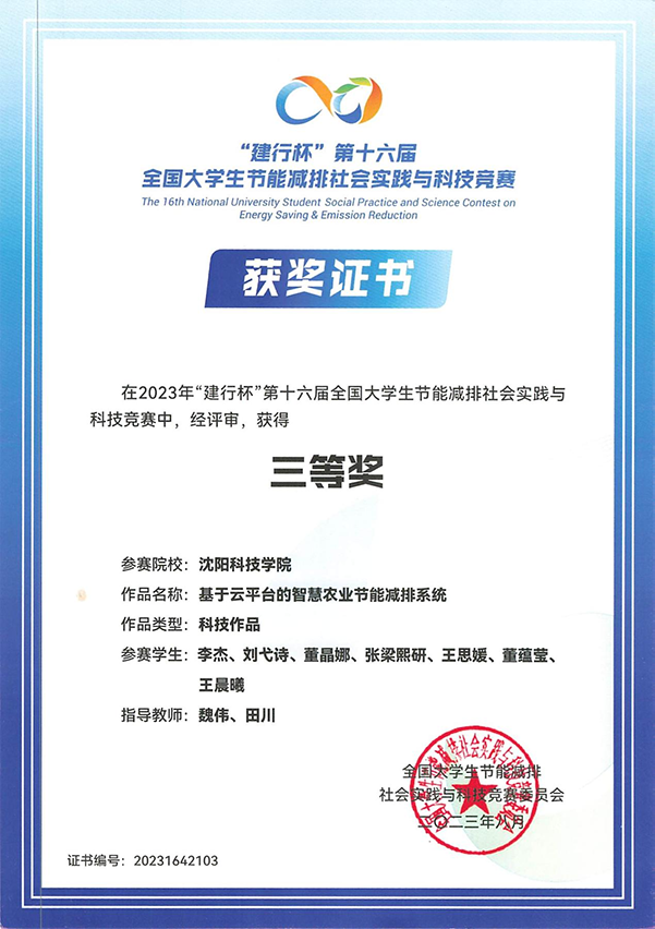 在2023年“建行杯”第十六届全国大学生节能减排社会实践与科技竞赛中,荣获国家级三等奖1项。