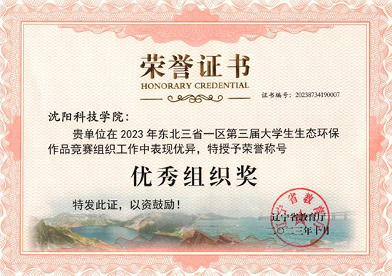 在2023年东北三省一区第三届大学生生态环保作品竞赛中,获二等奖3项、三等奖8项,并获“优秀组织奖”称号。