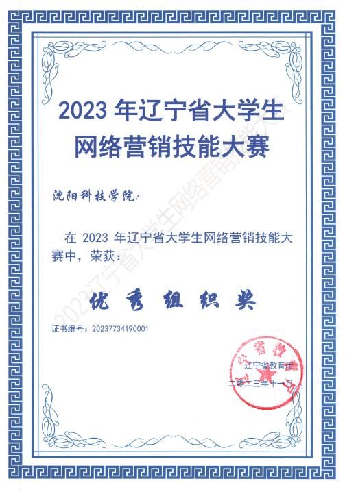 在2023年辽宁省大学生网络营销技能大赛中,获一等奖3项、二等奖4项、三等奖1项,并获“优秀组织奖”称号。