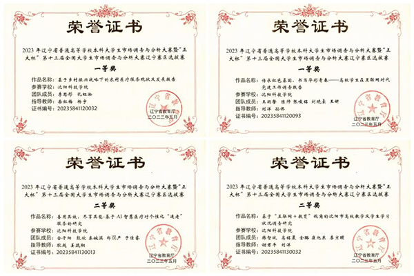 在2023年辽宁省普通高等学校本科大学生市场调查与分析大赛暨“正大杯”第十三届辽宁赛区选拔赛中,荣获一等奖2项、二等奖2项、三等奖3项。