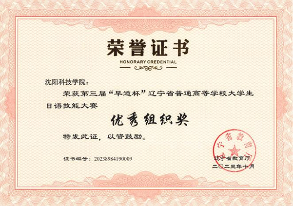 在第三届“早道杯”辽宁省普通高等学校大学生日语技能大赛中,荣获一等奖4项、二等奖5项、三等奖4项,并获“优秀组织奖”称号。