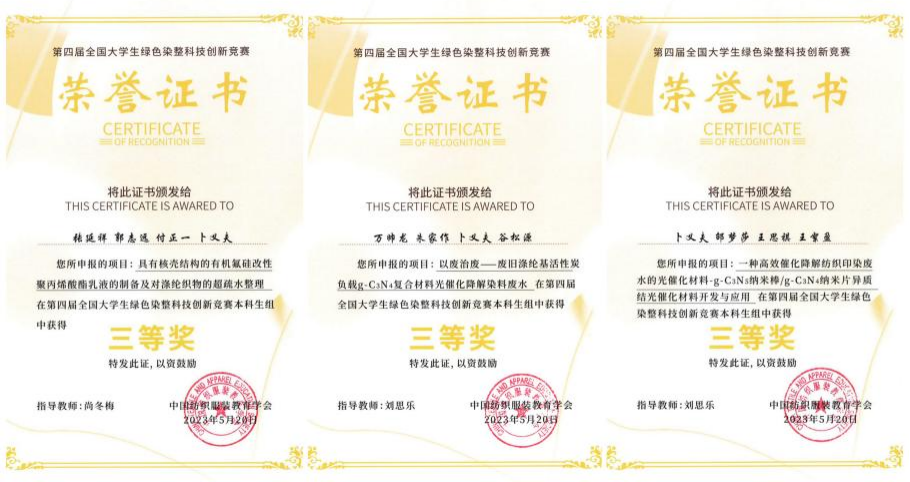 在第四届全国大学生绿色染整科技创新竞赛中,获三等奖3项。