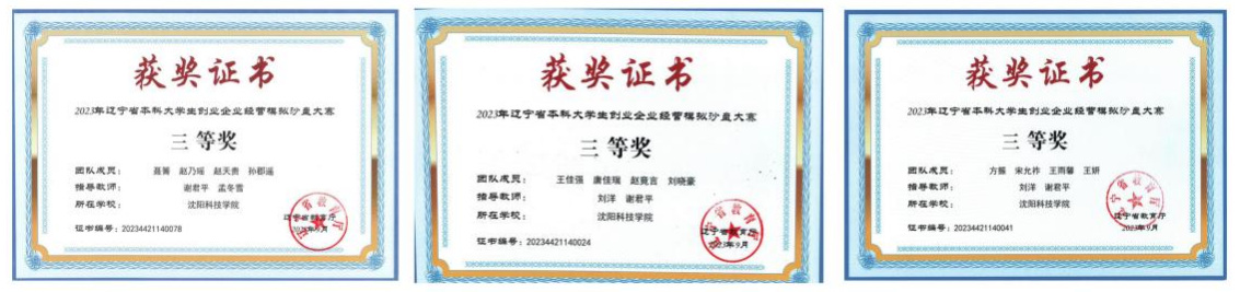 在2023年辽宁省本科大学生创业企业经营模拟沙盘大赛中,荣获三等奖3项。