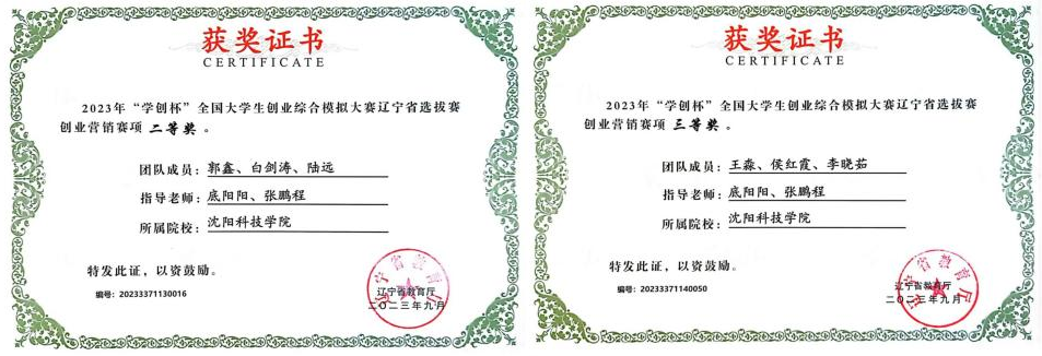 在2023年“学创杯”全国大学生创业综合模拟大赛辽宁省选拔赛创业营销赛中,获二等奖1项、三等奖1项。