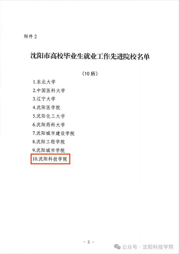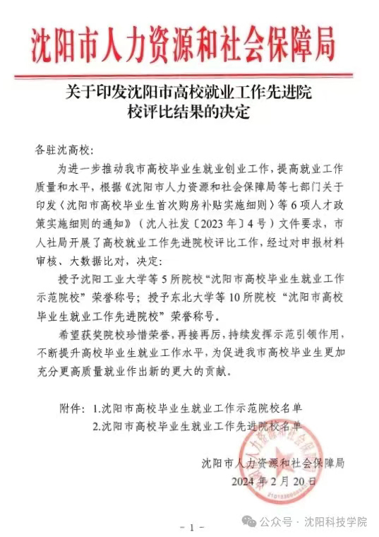 近日,沈阳市人力资源和社会保障局公布了沈阳市高校就业先进院校评比结果,我校荣获“沈阳市高校毕业生就业工作先进院校”荣誉称号。此次全市共授予5所院校“沈阳市高校毕业生就业工作示范院校”;授予10所院校“沈阳市高校毕业生就业工作先进院校”。