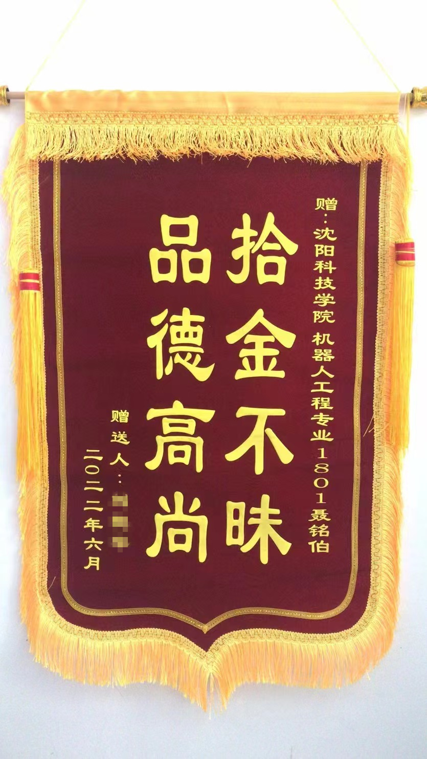 6月5日,失主向学校邮寄来了锦旗与感谢信,并致敬学校培养出这样高素质的优秀大学生。鉴于聂铭伯同学在校期间学习成绩良好,团结同学、积极进取,曾获校级优秀学生干部称号,结合拾金不昧表现,经学校研究决定,增授聂铭伯同学为2022届校级优秀毕业生荣誉称号,并动员全校师生学习聂铭伯同学拾金不昧的义举,自觉培养良好的人格品质,树立高尚的社会公德,让更多的美德和善举在校园、在社会广泛传递、蔚然成风。
