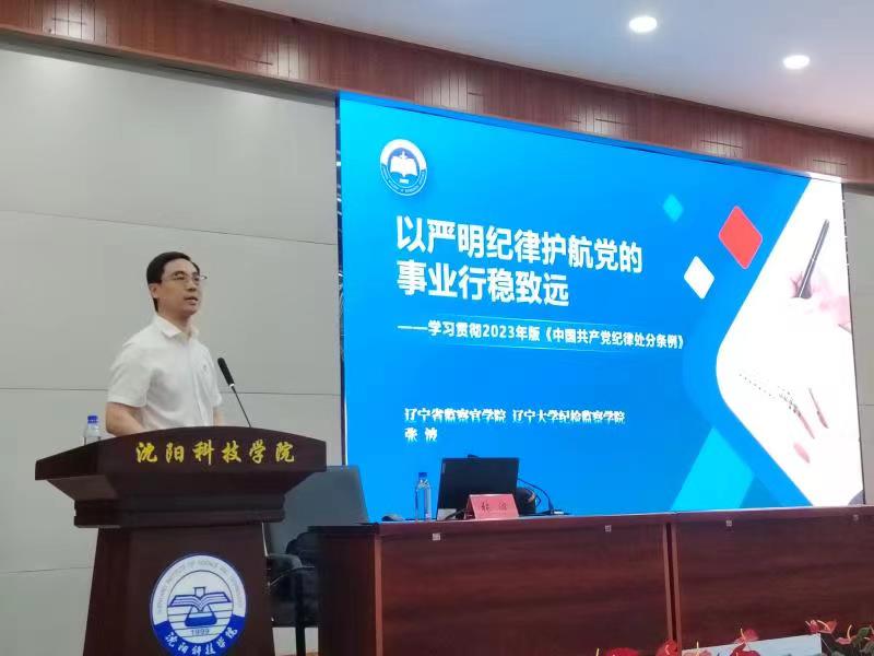 为推动党纪学习教育走深走实,深入学习新修订的《中国共产党纪律处分条例》(以下简称《条例》),切实提高党员干部的纪法意识,6月12日,学校组织开展党纪学习教育专题讲座,本次讲座邀请到辽宁省监察学院副院长、辽宁大学纪检监察学院副院长、辽宁大学思想政治工作研究院副院长张波,校领导班子成员,学校副科级及以上干部,各党总支(直属党支部)委员会和各党支部支委会全体成员以及各系部教研室主任参加了本次学习。