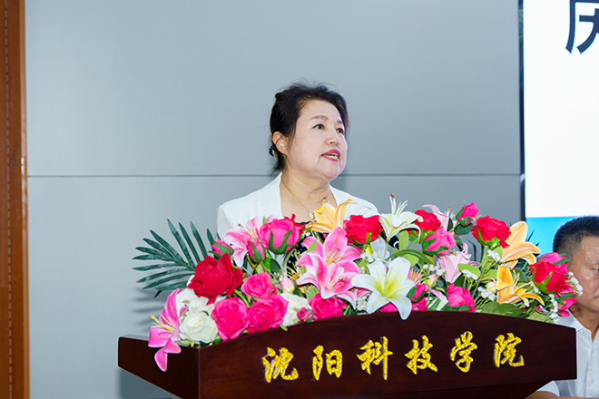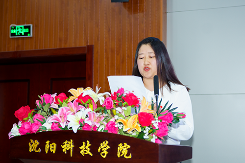 信息与控制工程系郭丹代表教师发言。她回忆过去一年在学校领导的带领下,面对学校本科教学合格评估带来的全新考验,全校上下拿出了遇水架桥、逢山开路的勇气与执着,深切表达了作为沈科一员的无上光荣和自豪。她将继续秉承创新的精神和实践的态度积极参与学校各项改革和发展,探索教育理念更新和教学方法创新,为沈科的教育事业贡献智慧和力量。