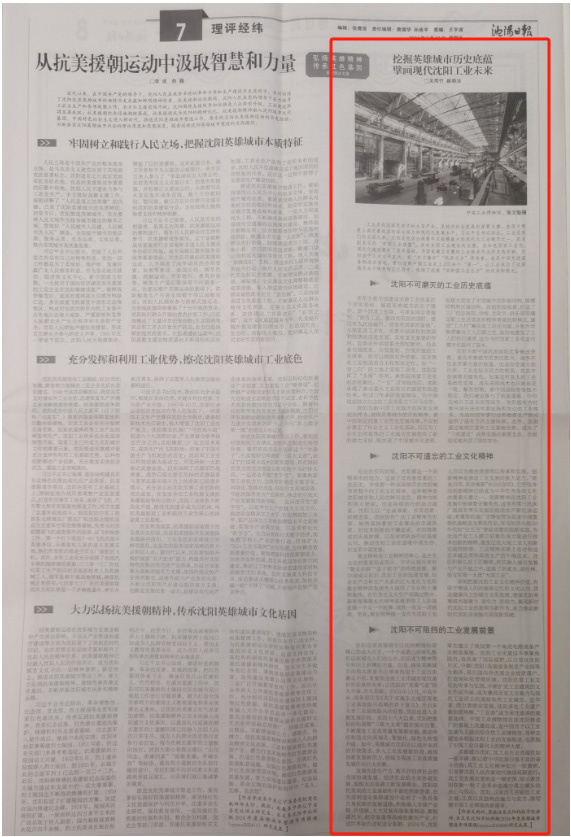近日,沈阳日报刊登了我校经济系教师关雨竹、崔晓洁撰写的文章《挖掘英雄城市历史底蕴 擘画现代沈阳工业未来》,该文章系沈阳市社科联2024年度英雄城市塑造专项课题(syyxcs202408)研究成果。文章充分体现了工业成为推动沈阳可持续发展的强劲引擎,也突出了工业对于塑造沈阳这座英雄城市深厚底蕴的重要作用。