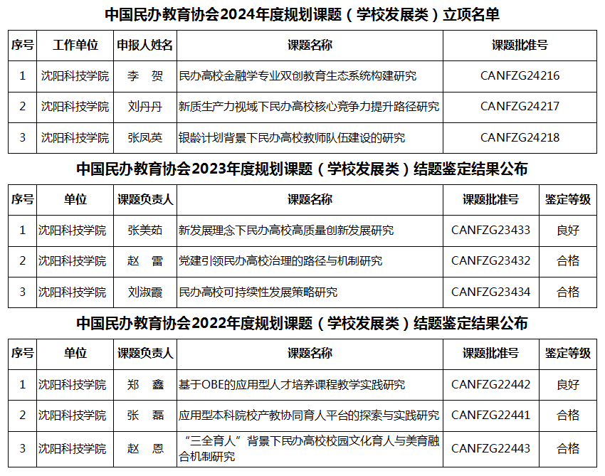 近日,中国民办教育协会发布了《中国民办教育协会2024年度规划课题(学校发展类)立项名单》《中国民办教育协会2021-2023年度规划课题(学校发展类)结题鉴定结果公布》。经本人申报、学校组织推荐、中国民办教育协会专家评审等程序,我校3项课题获批立项,6项课题顺利结项,其中《基于OBE的应用型人才培养课程教学实践研究》《新发展理念下民办高校高质量创新发展研究》等2项课题荣获“良好”鉴定等级!