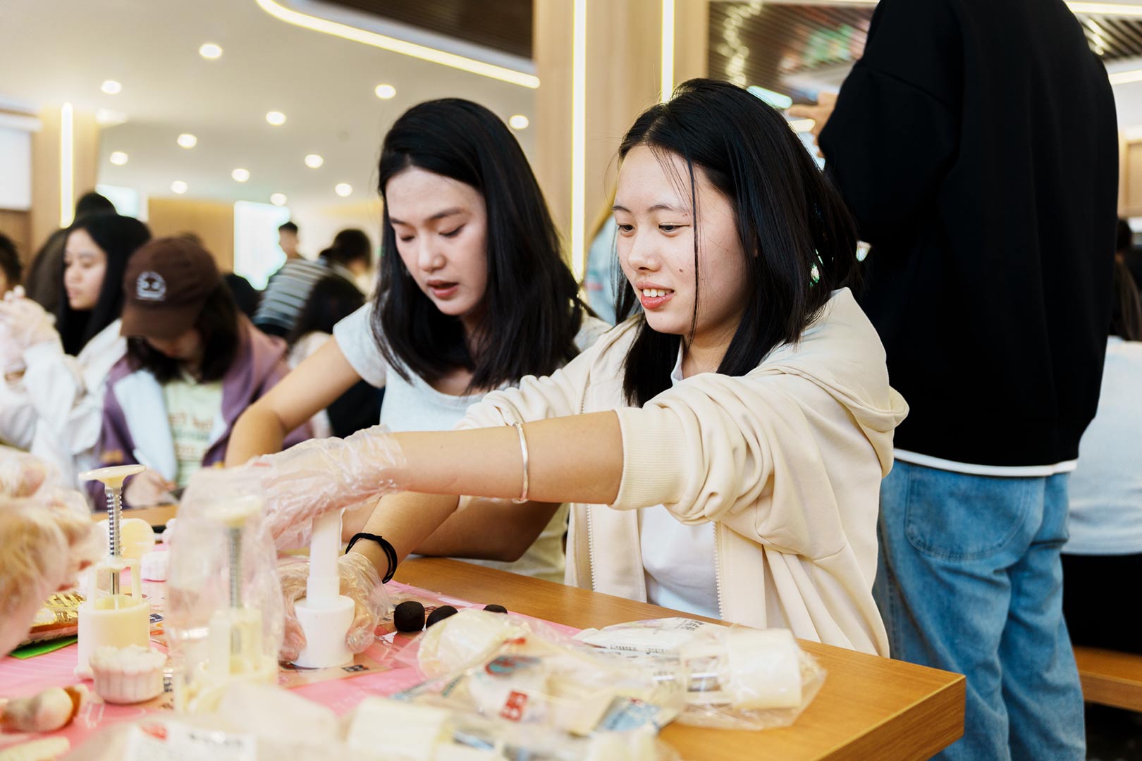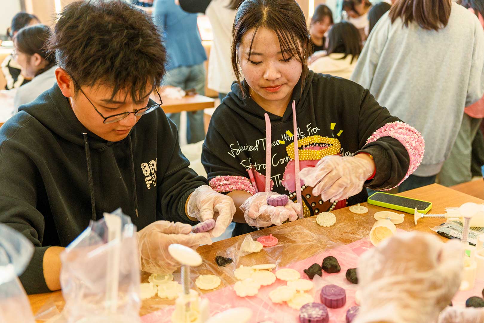 活动伊始,师生齐聚学校食堂三楼,在工作人员的指引下,同学们亲手制作了寓意团圆和美满的月饼,团、压、包、擀,用冰皮面料包裹红豆沙、板栗、黑芝麻、凤梨等陷料,制作一枚枚带有沈科元素的月饼。在欢声笑语中,师生感受着中秋节的欢快气氛与团聚在沈科的甜蜜。