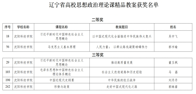 根据《关于开展辽宁省高校思想政治理论课精品教案评选工作的通知》(辽教发〔2024〕6号)要求,经自主申报、学校推荐、专家评审、会议审定、面向社会公示等环节,我校马克思主义学院6名教师在此次评选活动中取得佳绩。