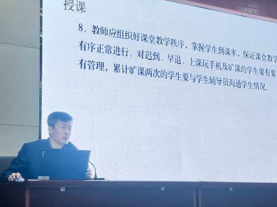 教务处副处长王兴华为新教师介绍了学校教学工作规范及基本要求,主要从教学组织管理架构、课堂教学规范、上课“五件套”、大学课堂教学设计、做“终身学习者”五个方面进行了讲解。