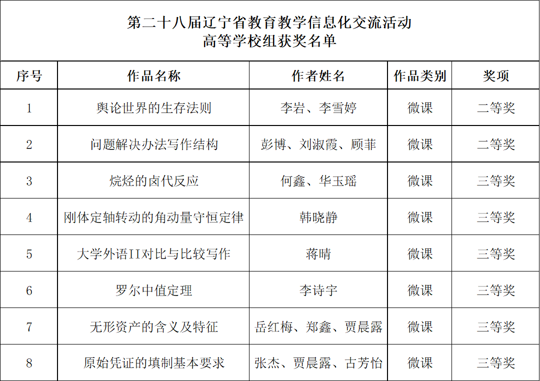 近日,辽宁省教育厅公布了第二十八届辽宁省教育教学信息化交流活动获奖名单,我校选送的《舆论世界的生存法则》等8项微课作品全部获奖,其中二等奖2项、三等奖6项。
