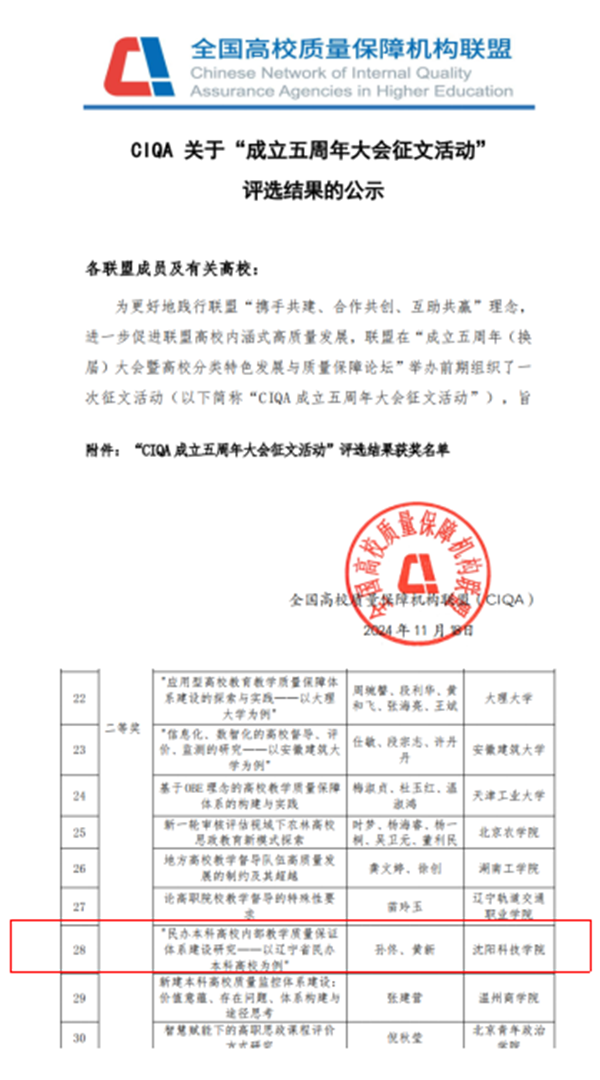 近日,CIQA联盟在“高校分类特色发展与质量保障论坛”举办前期组织了一次征文活动,我校教学质量管理处孙佟、黄新老师的论文《民办本科高校内部教学质量保证体系建设研究——以辽宁省民办本科高校为例》荣获二等奖,这是对学术水平和研究能力的肯定,彰显了我校在教育质量保障领域的深厚底蕴和积极探索,引领我校教育高质量发展迈向新的高度。