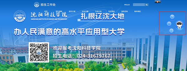 登录学校招生网站http://zhaosheng.syist.edu.cn/,可以通过右侧悬浮栏“智能问答机器人”进行在线咨询,查看学校招生简章等信息。