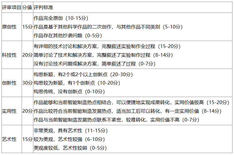 参赛作品必须符合当代智能制造科技发展方向和理念,且具有科学性、创新性、实用性、系统性的正在构思的创意创新作品或已设计出模型或实物作品。重点围绕智能产品、智能服务、智能装备、智能生产线、智能车间、智能工厂、智能研发、智能管理、智能物流与供应链、智能决策等领域。