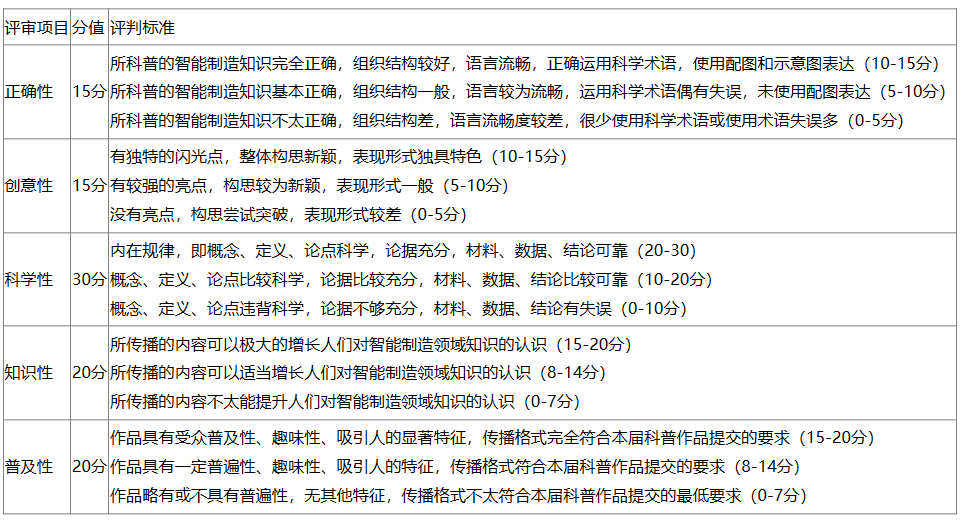 参赛作品的创作要以提高广大师生智能制造认知科学素质为目标,围绕智能制造的特征和模式,须具备科学性、普及性和实用性,同时还应具备一定的趣味性和通俗性。