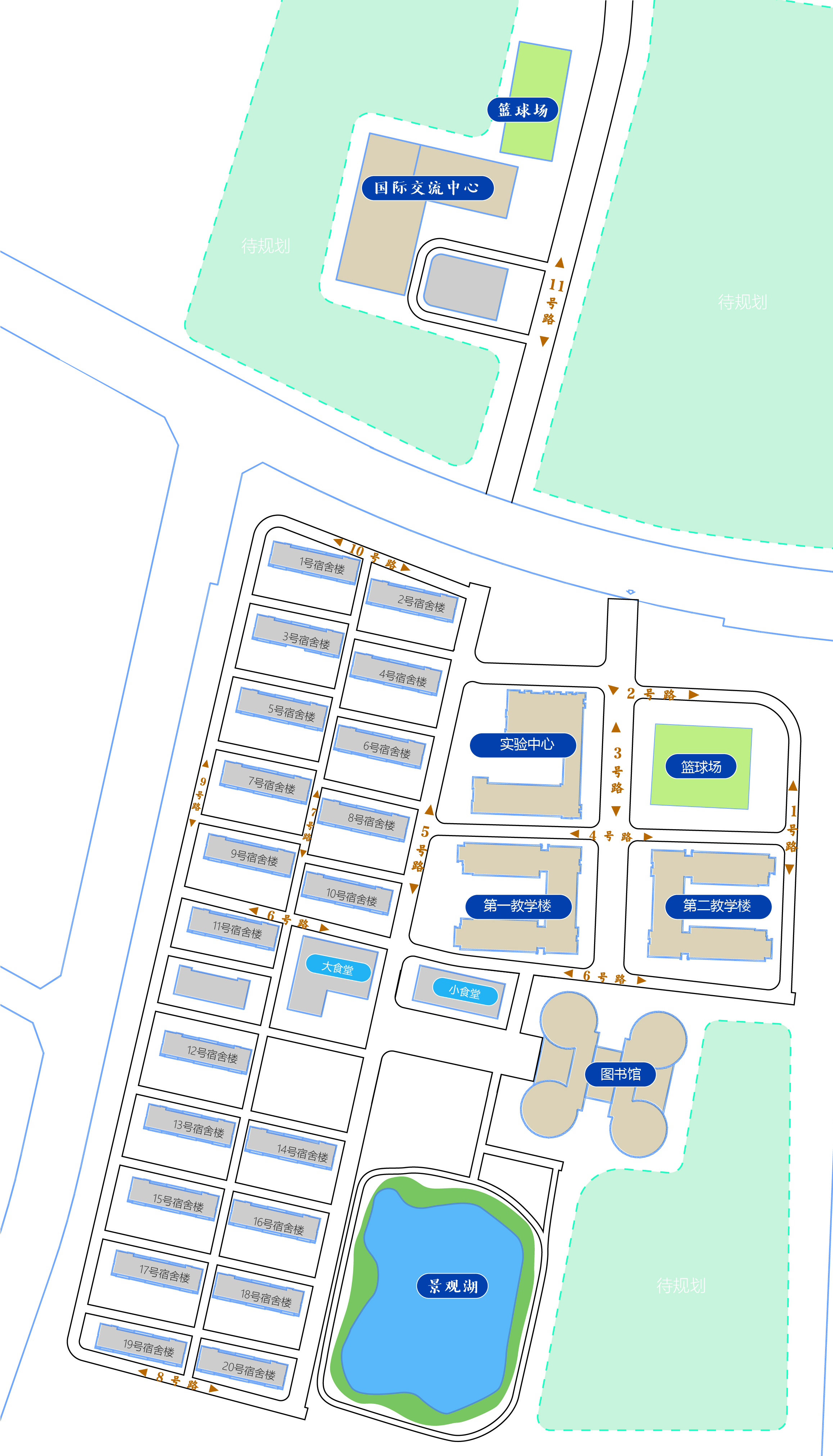 1.南校区:第一教学楼、第二教学楼、实验中心、图书馆(含前广场)、篮球场、景观湖、小食堂、大食堂和校园主要道路。
