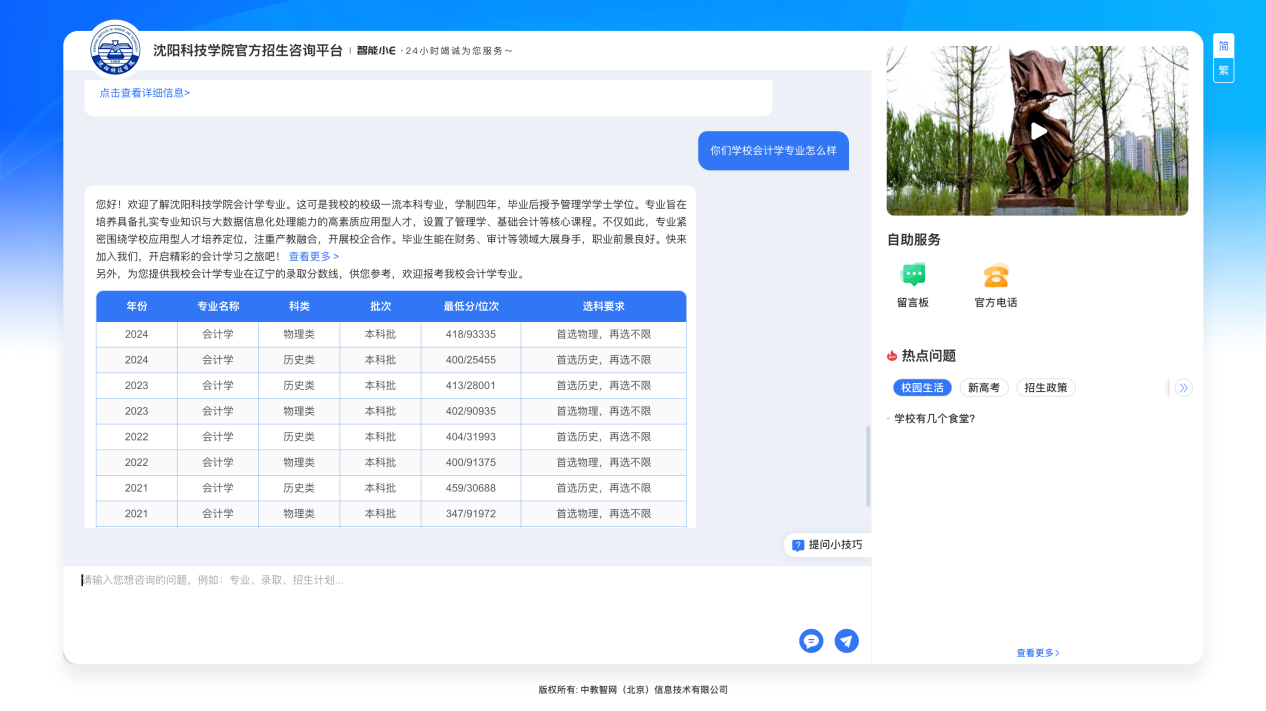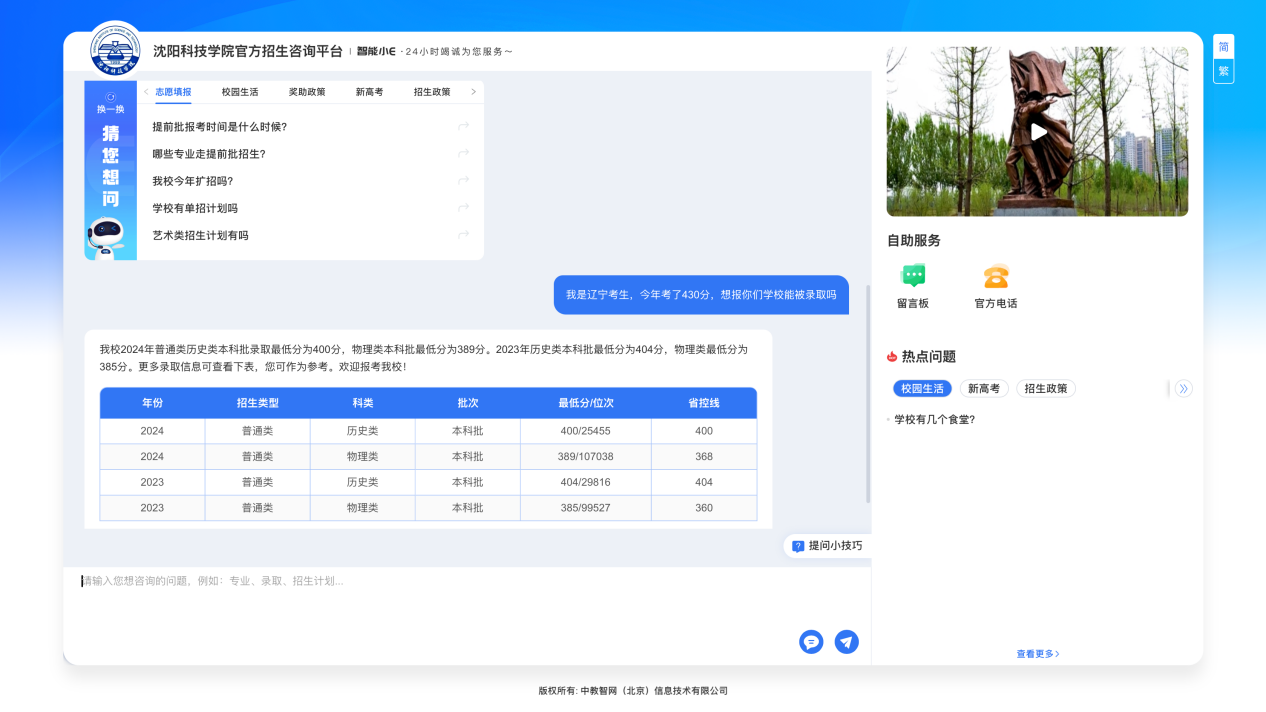 问答示例:当你问“我是辽宁考生,今年考了430分,想报你们学校能被录取吗”时,系统不仅能通过DeepSeek大模型技术精准识别你的咨询意图是:省份、分数、录取分数,还会结合历年录取数据,为你提供更有参考性的回复!