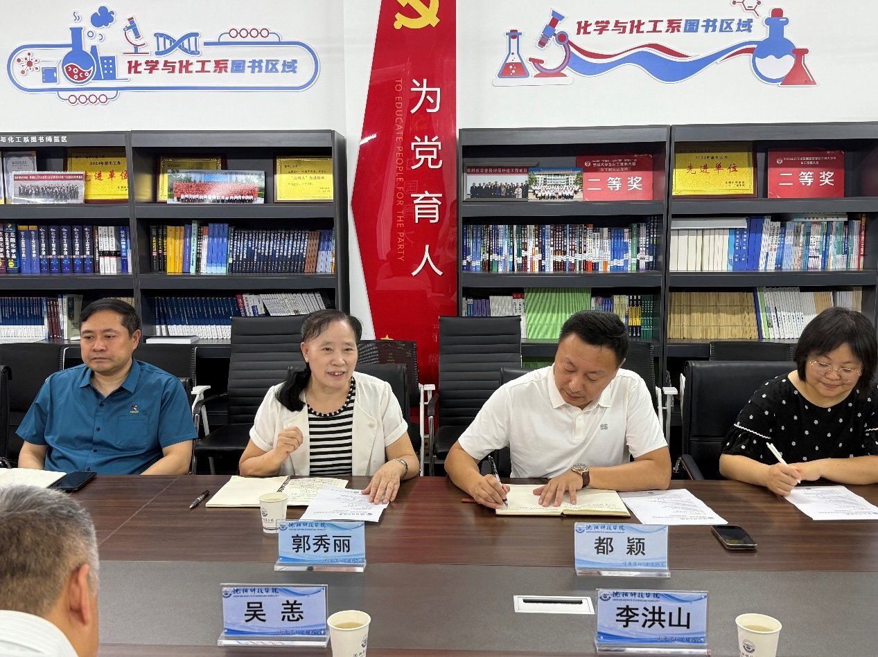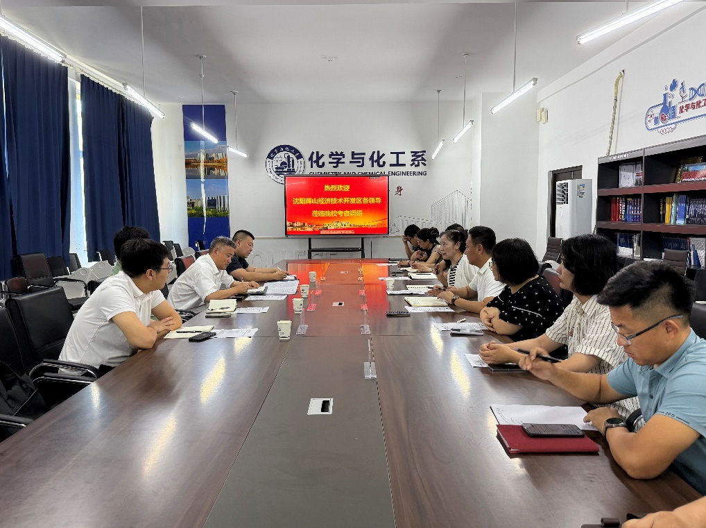 近日,沈阳辉山经济技术开发区投促三中心主任吴恙、招商一局局长张林、助理王星乔、沈北新区科学技术局校地合作科科长李洪山等一行4人莅临我校化工与制药学院开展座谈交流。校副董事长、正校级调研员郭秀丽出席会议,化工与制药学院党总支书记都颖、常务副院长刘慧、副院长单译及学院各科研机构负责人参加会议,会议由化工与制药学院党总支书记都颖主持。